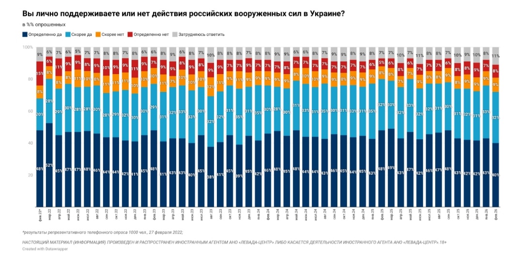 В феврале в России до 25% уменьшилось количество граждан, которые поддерживают продолжение войны РФ против Украины. Количество россиян, которые считают, что сейчас нужно начать мирные переговоры, выросло до 67%, свидетельствуют данные опроса социологической службы «Левада-центр», проведенного в с 18 по 25 февраля 2026 года.