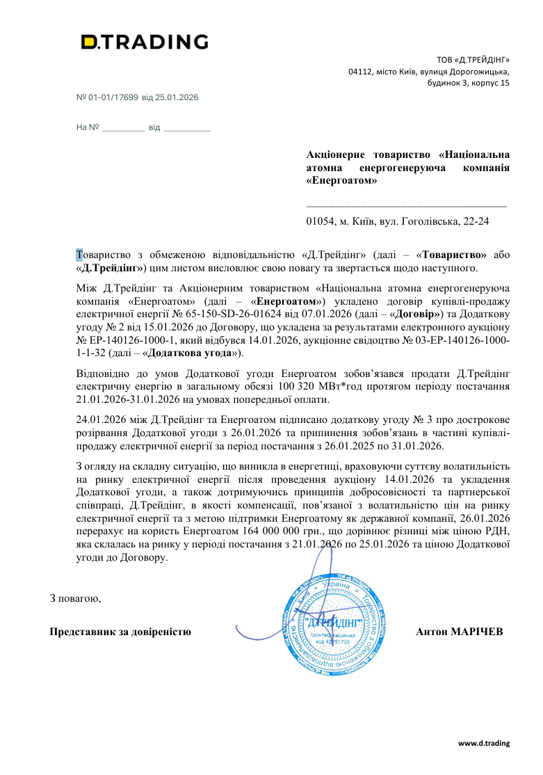 «Учитывая сложную ситуацию, возникшую в энергетике, учитывая существенную волатильность на рынке электрической энергии после проведения аукциона и заключения Дополнительного соглашения, а также соблюдая принципы добросовестности и партнерского сотрудничества, Д.Трейдинг, в качестве компенсации, связанной с волатильностью цен на рынке электрической энергии и с целью поддержки Энергоатома как государственной компании, 26.01.2026 перечислит в пользу Энергоатом 164 000 000 грн, что равно разнице между ценой РДН, которая сложилась на рынке в периоде поставки с 21.01.2826 по 25.01.2026 и ценой Дополнительного соглашения к Договору», — заявили в компании.