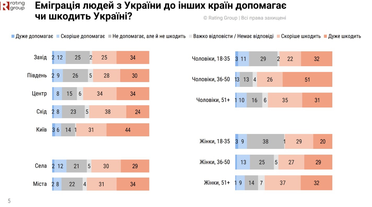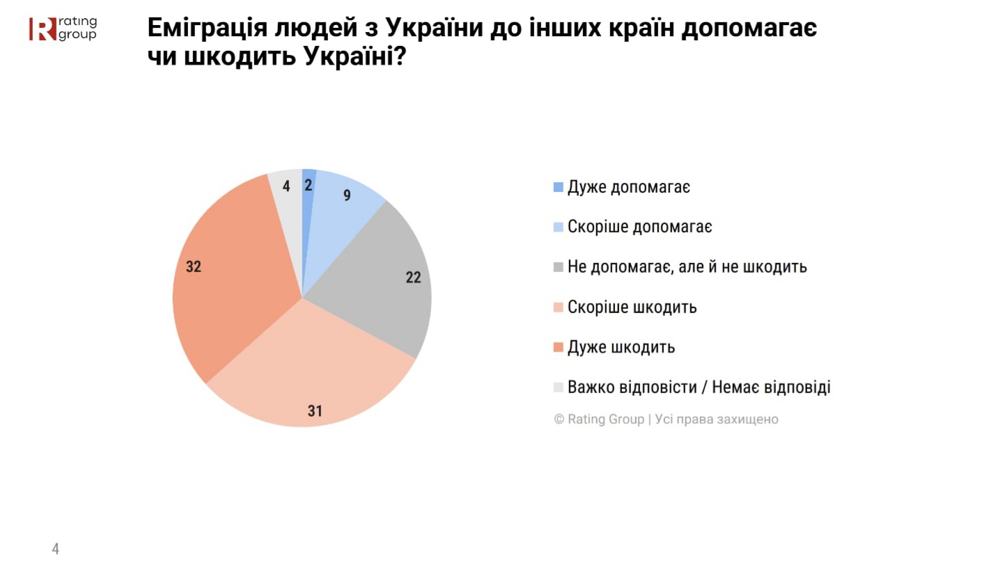 В Украине абсолютное большинство граждан (63%) убеждены, что переезд украинцев за границу вредит нашей стране. Противоположное мнение имеют 11% опрошенных. Еще 22% респондентов считают, что выезд граждан не помогает и не вредит Украине, свидетельствуют данные ежегодного опроса международной социологической ассоциации Gallup International, который в Украине проводила Социологическая группа «Рейтинг» с 11 по 14 ноября 2025 года.