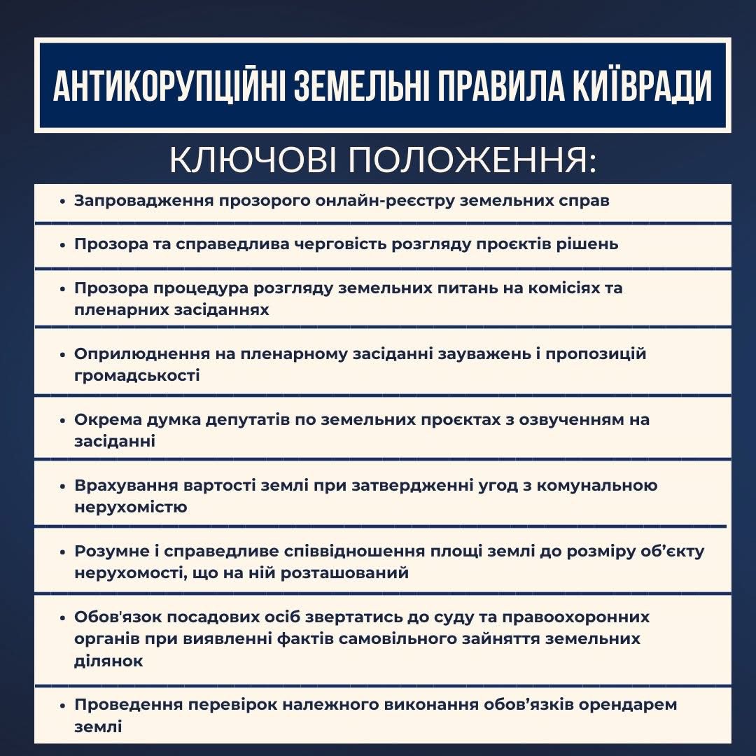 Киевская городская рада на заседании 9 октября приняла новые «Правила подготовки и принятия решений органами Киеврады о приобретении и прекращении прав на землю коммунальной собственности в городе Киеве», которые определяют прозрачные и унифицированные процедуры управления землей Киева. Как сообщила депутат Киевской горрады Виктория Пташник, инициативу поддержал 61 депутат.