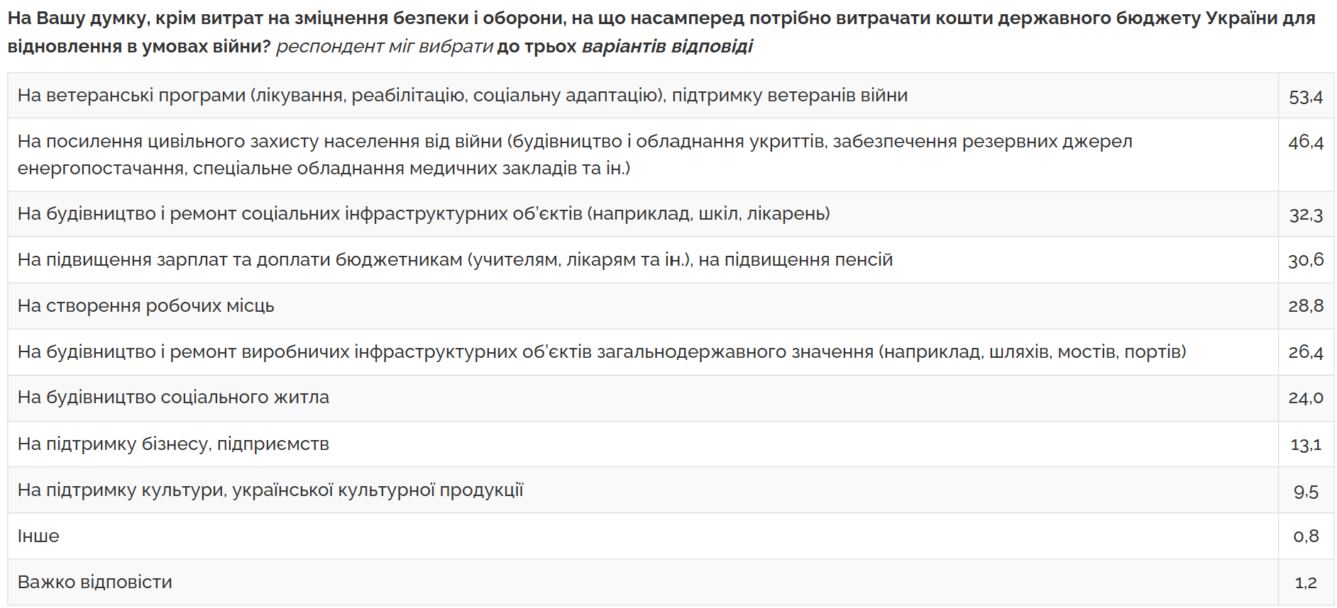 Также 46% отметили, что деньги из госбюджета кроме обороны стоит в первую очередь тратить на усиление гражданской защиты населения, в частности, строительство и оборудование укрытий, обеспечение резервных источников энергоснабжения, специальное оборудование медицинских учреждений и др. Следующие ответы звучали так: