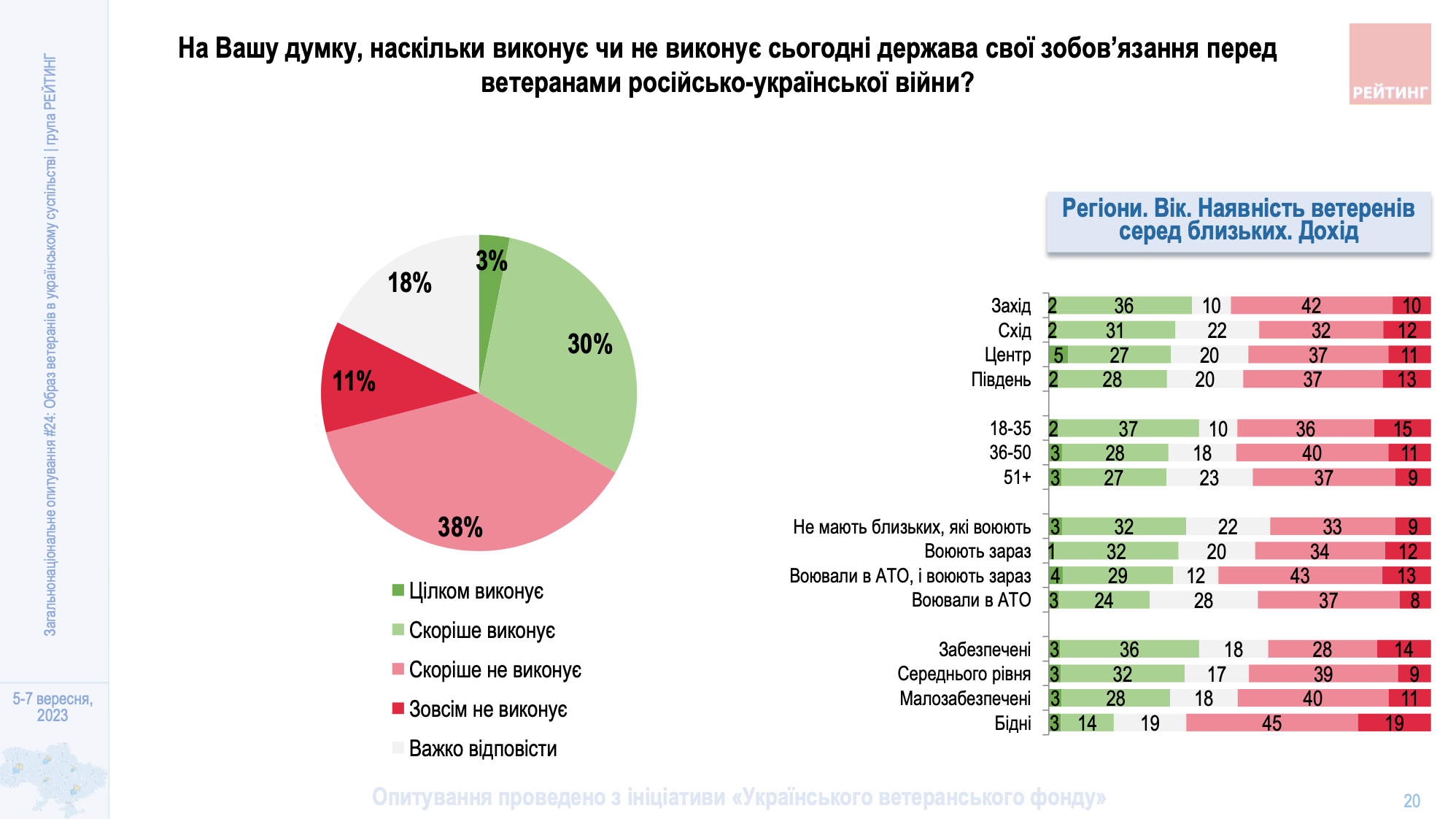 «Сегодня почти половина тех, кто думает иначе (49%) в группе, говорят «Рейтинг. «Негативное мнение о выполнении обязательств государства перед ветеранами чаще имеют жители западных регионов, представители молодого поколения и более обеспеченные люди».