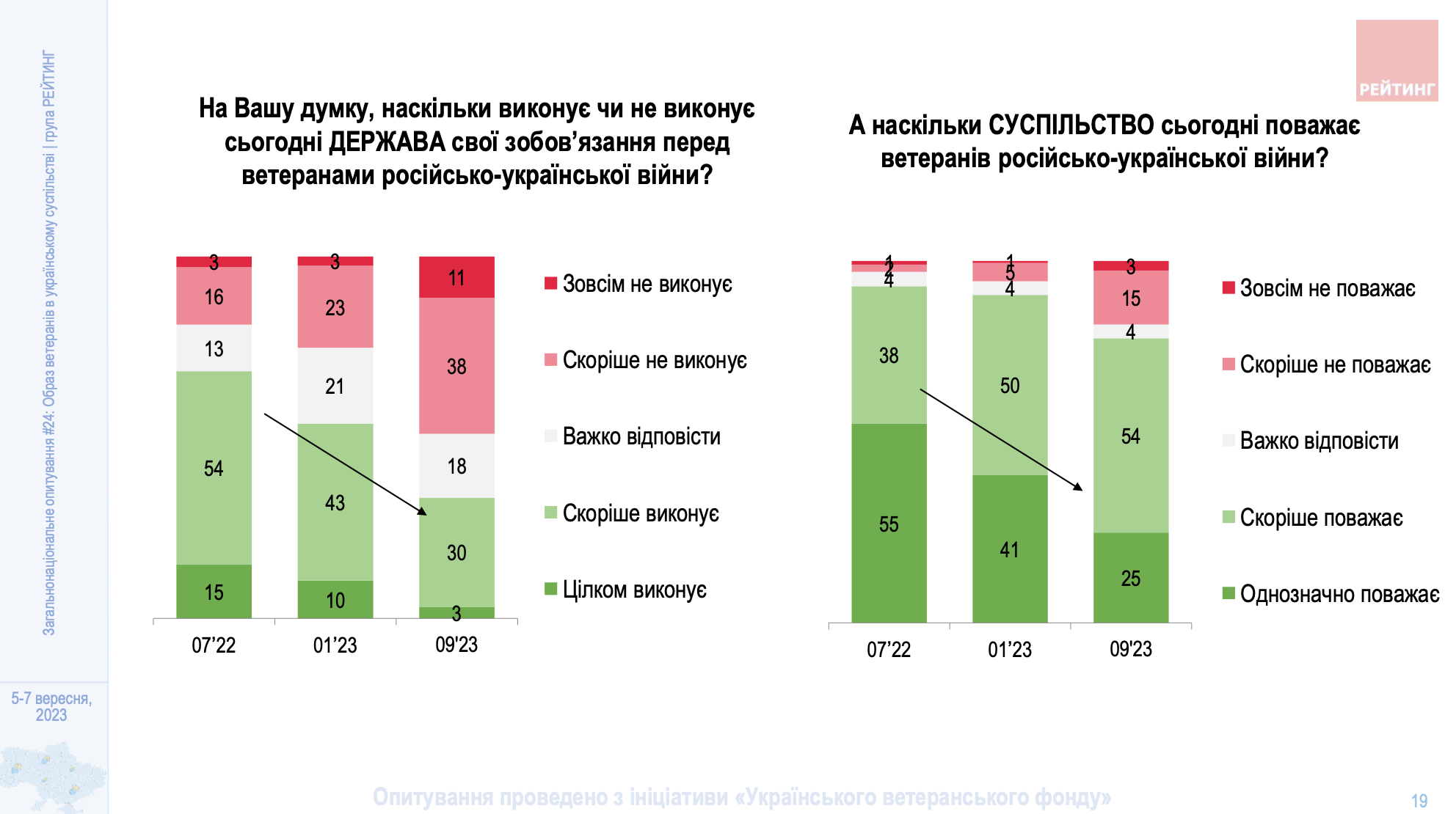 Количество украинцев, которые считают, что государство выполняет свои обязательства перед ветеранами Вооруженных Сил Украины, сократилось на 16%. По данным группы оценки, в августе 2022 года таких людей было 69%, в январе 2023 года – 53%, а в сентябре 2023 года – 33%.