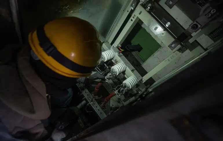 Сотрудник компании ДТЭК ремонтирует электрическую подстанцию после российской атаки, Киев, Украина / 21 января 2026 года Троещина мерзнет, люди включают ...