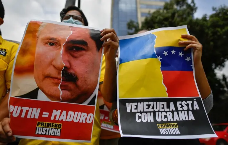 Активист держит плакат с изображением главы Кремля Владимира Путина и диктатора Николаса Мадуро во время протеста против российского вторжения в ...