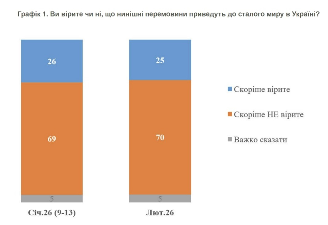 В Украине четверть граждан (25%) верят в то, что переговоры с РФ, которые сейчас продолжаются, приведут к устойчивому миру, в то же время абсолютное большинство опрошенных (70%) — не верит в это, свидетельствуют данные опроса Киевского международного института социологии.