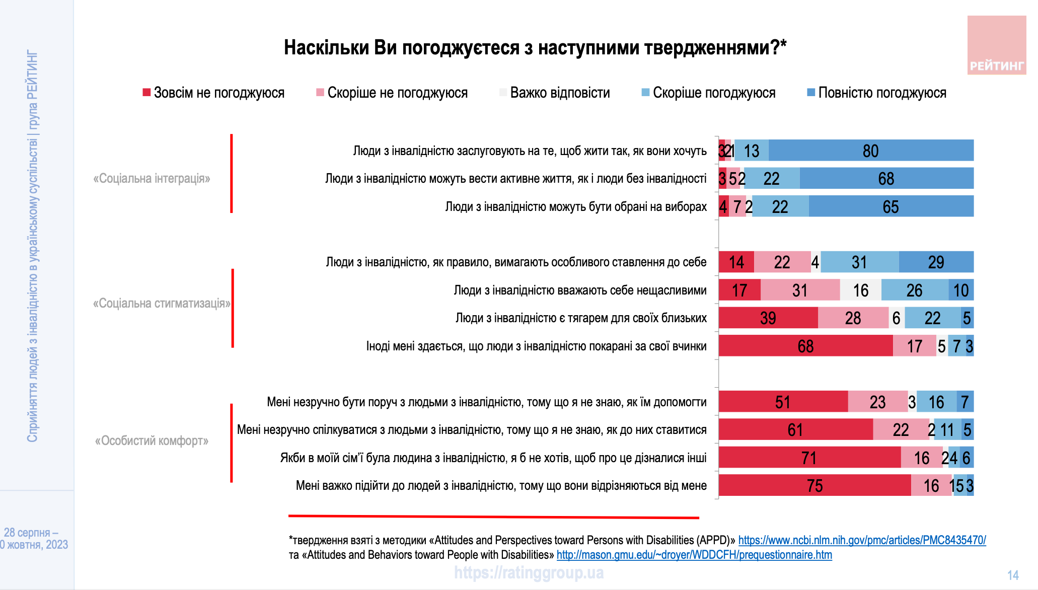 Также украинцы считают, что люди с инвалидностью могут вести активную жизнь и участвовать в выборах. Наряду с этим большинство украинцев, а именно 51%, соглашаются, что им неудобно быть рядом с такими людьми, ведь они не знают, как им помочь.