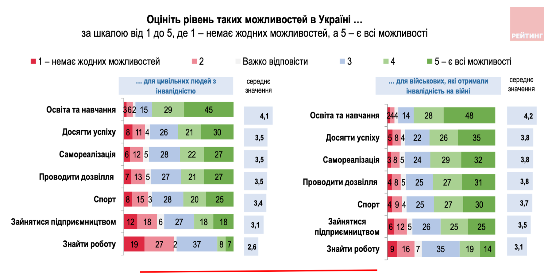 Возможности для военных, получивших инвалидность на войне, оценивают несколько выше, чем возможности для гражданских с инвалидностью. Причина, по мнению украинцев, в том, что защитники должны получать от общества больше помощи и поддержки.