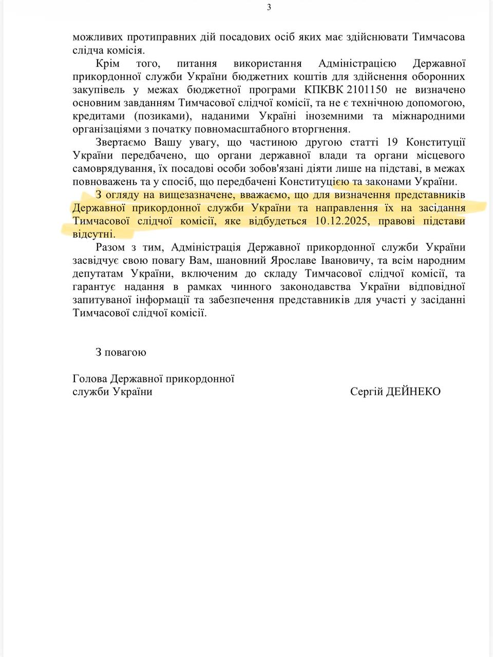 Руководство Государственной пограничной службы Украины отказалось прийти на заседание Временной следственной комиссии Верховной Рады Украины по раскрытию масштабной коррупции в энергетике под руководством Тимура Миндича. В частности администрация Государственной пограничной службы Украины направила письмо за подписью руководителя службы Сергея Дейнеко председателю ВСК по вопросам расследования возможных противоправных действий должностных лиц органов государственной власти, других государственных органов и субъектов хозяйствования государственного сектора экономики, которые могли нанести ущерб экономической безопасности Украины народному депутату Украины Ярославу Железняку, в котором заявила об «отсутствии правовых оснований» направления представителей ГПСУ на заседание ВСК. Соответствующее письмо опубликовал депутат Железняк.