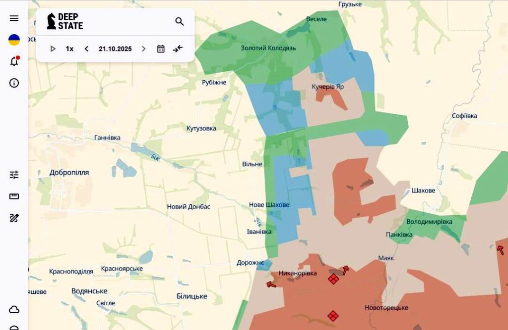 Лінія фронту в районі Добропілля станом на 21 жовтня/DeepStateMAP