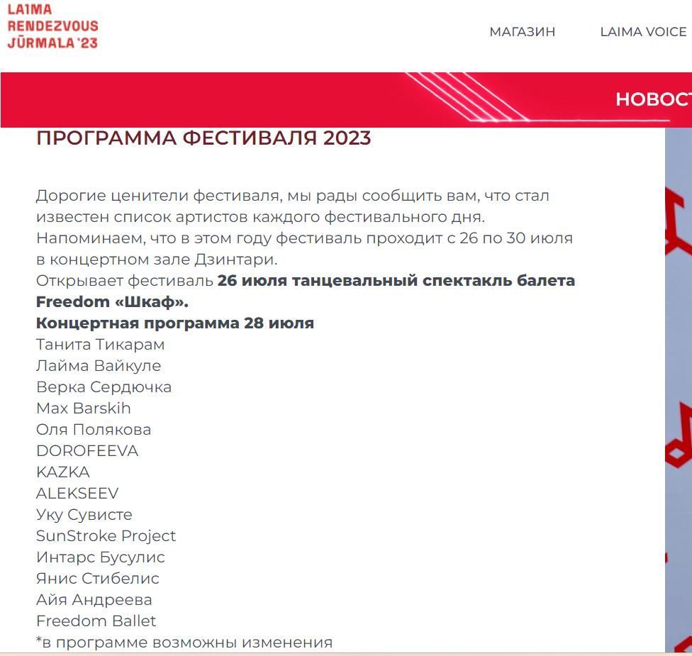 Следует отметить, что в программе концерта, опубликованной на официальном сайте фестиваля, не было заявлено ни одного артиста-путинца. Ежегодно на мероприятии в Лайме выступали Киркоров, Лепс, Стас Михайлов, Лолита и другие артисты, которые поддерживают убийства украинцев.